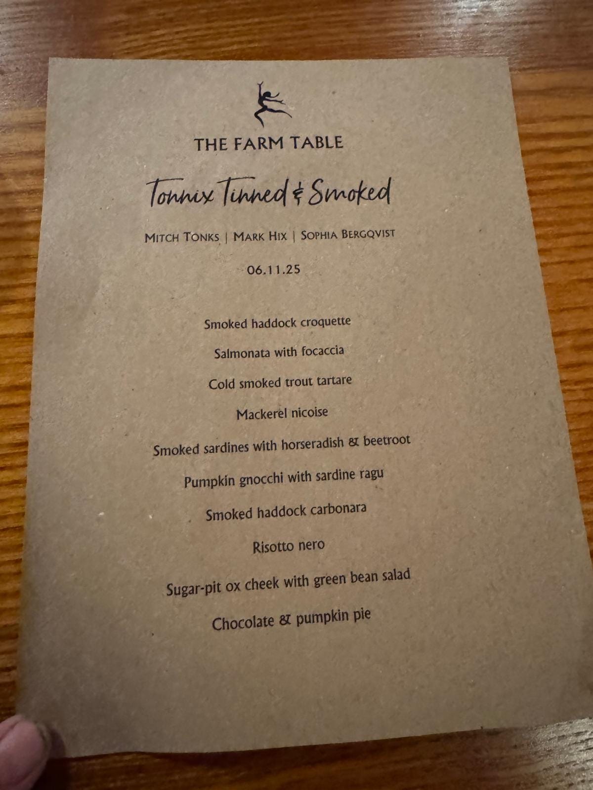 Mitch and I recently did a dinner at our friends Dart’s Farm in Devon. We called the evening Tonnix Tinned and Smoked and cooked 9 courses of inspiring dishes with Rockfish tinned seafood and my Hix Smokin’ House fish washed down with Tonnix wine from Quinta de la Rosa.